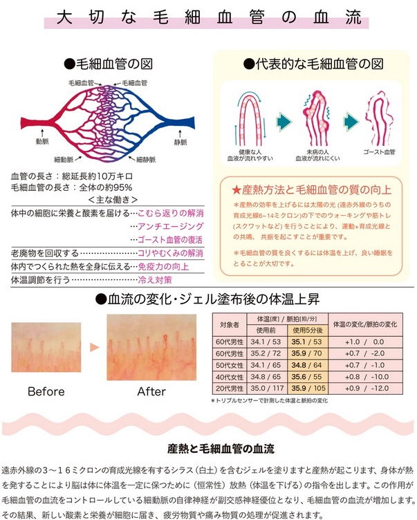 毛細血管は人間の最大の臓器です、37兆2億と言われています細胞に新しい酸素と栄養を届ける重要な働きがあります。また毛細血管の数は60歳代では20歳代と比較し約20%減少すると言われます。